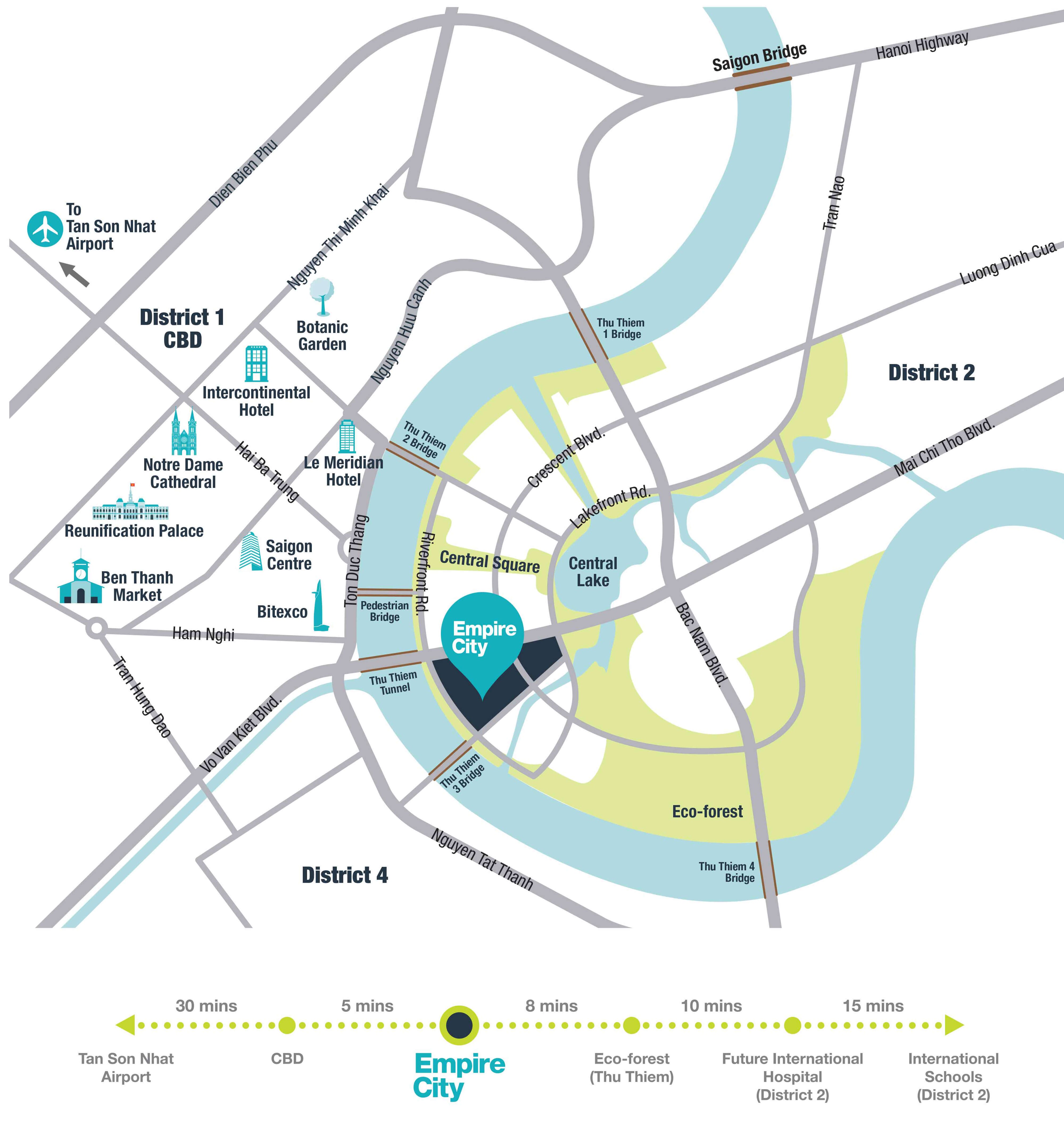 Với tầm nhìn hướng ra sông Sài Gòn và khu trung tâm hiện hữu của TP.HCM, khu Đô thị mới Thủ Thiêm được quy hoạch phát triển thành trung tâm kinh tế, thương mại và tài chính lớn nhất TP.HCM, mang đến hàng loạt các hoạt động về văn hoa, thư giãn và giải trí. Thông qua Đại lộ Đông – Tây và hầm Thủ Thiêm, thời gian di chuyển từ dự án Empire City đến khu trung tâm hiện hữu TP.HCM chỉ mất 5 phút.