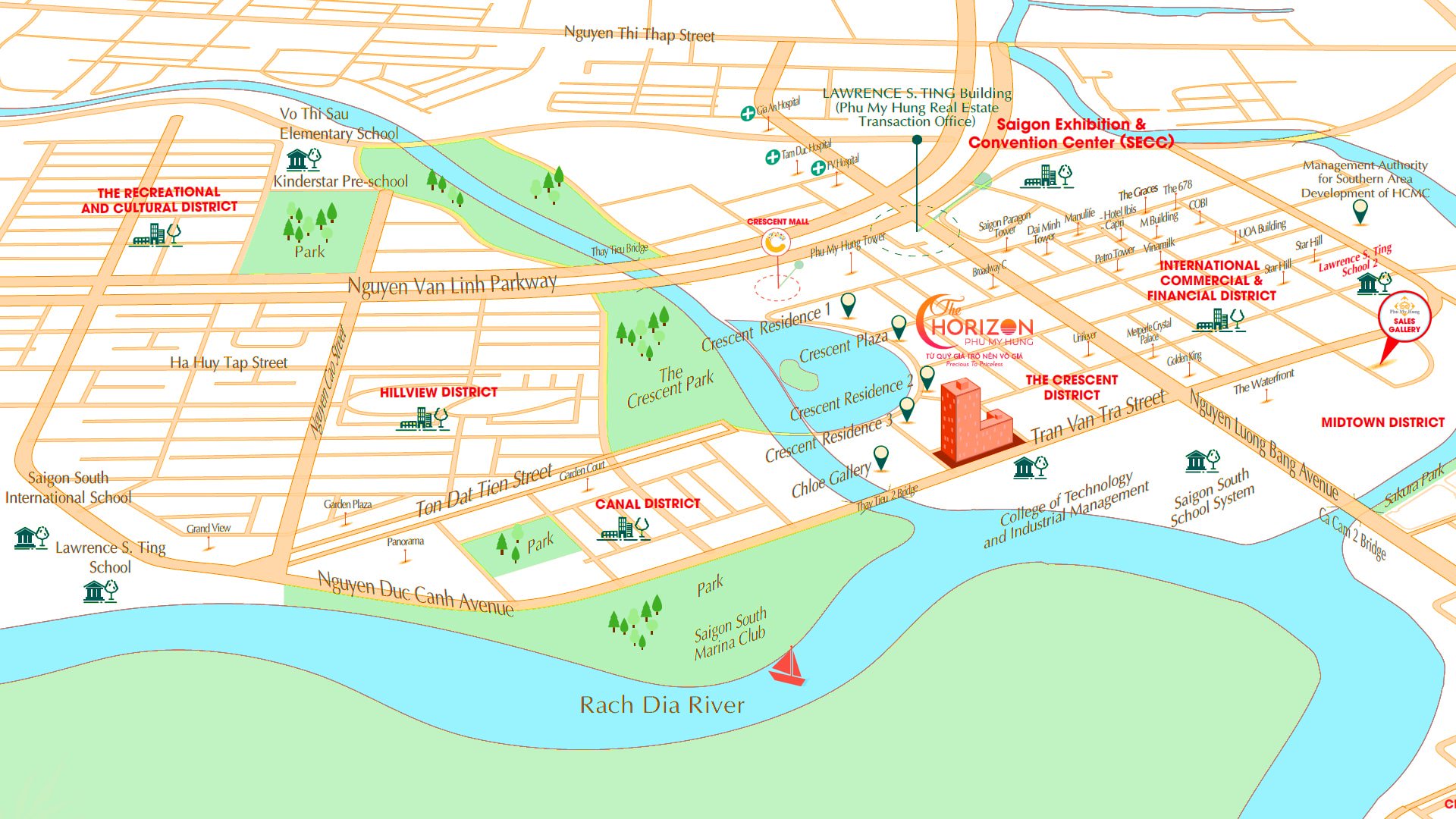 Nằm trong quỹ đất còn sót lại hiếm hoi trong bối cảnh quỹ đất phát triển nhà ở của Phú Mỹ Hưng chỉ còn vỏn vẹn chưa đầy 5%. Dự án toạ lạc tại mặt tiền đường Trần Văn Trà, cạnh Hồ Bán Nguyệt, đây được xem là vị trí trung tâm - trái tim của đô thị Phú Mỹ Hưng với hàng loạt các tiện ích đẳng cấp chỉ trong “một bước chân”